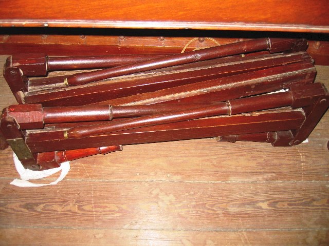 Here is a photo of the bed folded up. It forms a package about 36" wide and 12" square. The headboard, canopy frames, and mid-rail frame is not shown in this photo. Beds like this were not uncommon during the American Revolutionary War, and period documents indicate they were used at least by relatively low-ranking British officers as well.