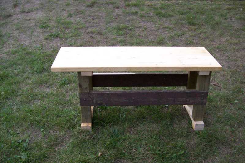 made mostly from leftover and recycled lumber, deck screws and re-used carriage bolts. 25 inches high, 44 inches long, and um, 18 ish wide (whatever you get from two pieces of 2X10 jointed and glued up)