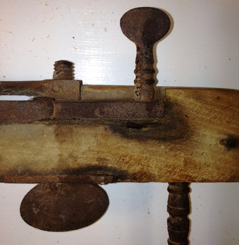 This closeup shows what appears to be an unthreaded thumb screw (peg?) in a position that would allow it to be used as a depth adjustment for the possible thickness gauge formed by the spring arm. At present the end of the thumb peg is level with the underside of the arm in which it is affixed. It does not protrude and thus is presently not providing support for the spring arm assembly. The thumb peg is too rusted to move.