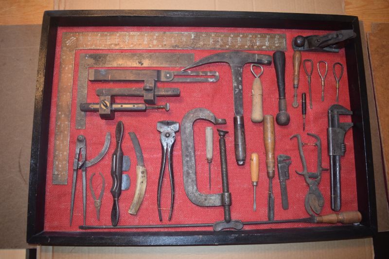 32" wide by 23" tall. A few nice tools. Stanley No 1 bench plane in upper right corner. Blade stamped L. Bailey in half circle - Patented - Dec 24, 1867 (I think 67).