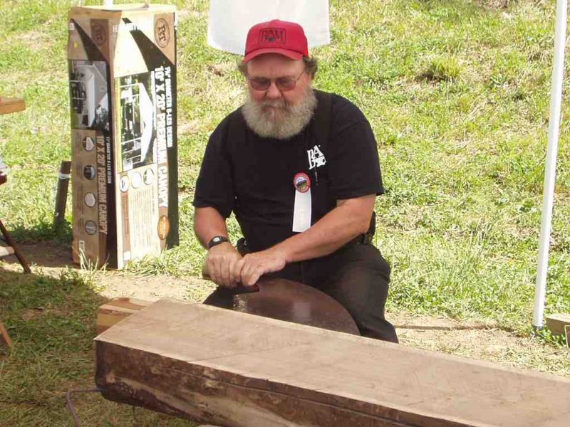 That's me in my BAM outfit. Notice that someone else has already done most of the cut for this slab. One cuts a bit on one side then switches to the other, maintaining 45 degree cuts that meet in the middle. Kind of like resawing.
