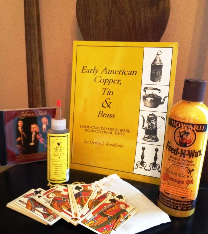 Elf Scott Garrison is both prescient and creative! I now have a CD recording of fiddle and guitar performance of music from Thomas Jefferson's library, a set of lovely 17th century French playing cards (now I really have to finish that folding table), Kauffman's wonderful book on Early American Copper, Tin & Brass, a bottle of Old Brown Glue (now I have no excuse not to use hide glue on my next project), and a bottle of beeswax and orange oi wood conditioner (and I've got an old family rocker that's going