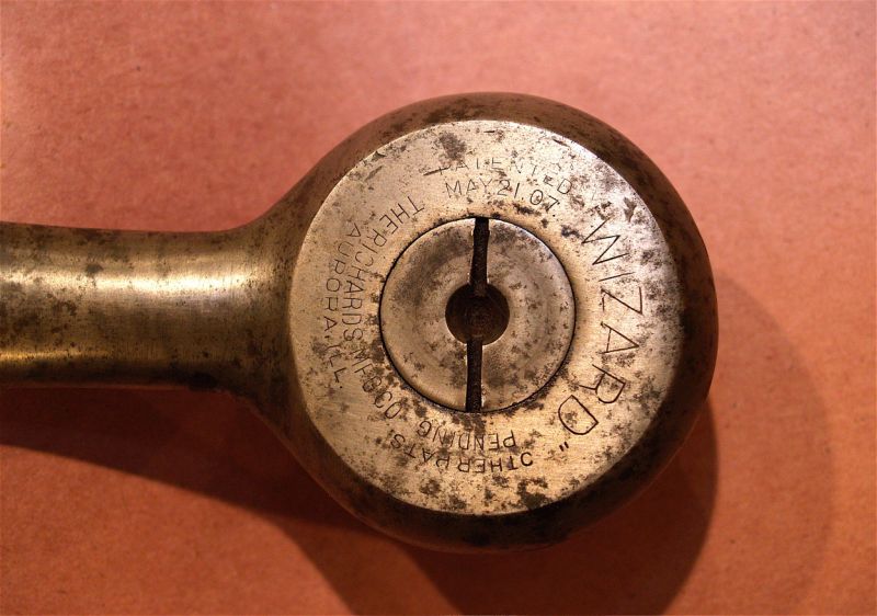 The text on the back says ''WIZARD THE RICHARDS MFG CO AURORA, ILL - PATENTED MAY 21, 07 OTHER PATS PENDING"
