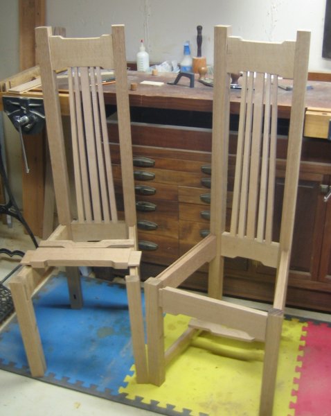 The backs of both chairs are complete, and I am about halfway through fitting and housing the side rails.